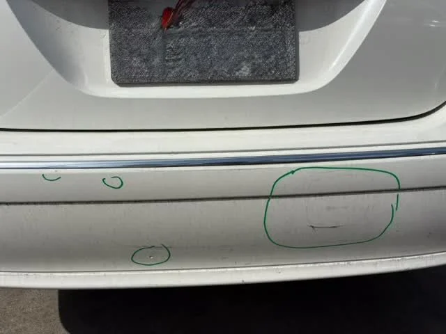 Before & After Repairs and Repaint on Mercedes E500 Rear Bumper, Left & Right Roof Moldings, Hood dents and rock chips